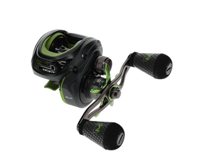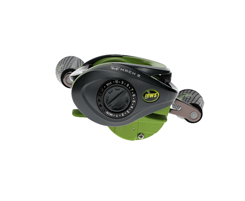Bobina di baitcasting del marchio Lews modello Mach 2 in colore nero e verde, speciale per la pesca al black-bass e ai predatori.