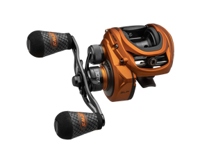 Bobina di casting del marchio Lews modello Schiacciare in nero e arancione, specialmente per la pesca al black-bass e ai predatori.