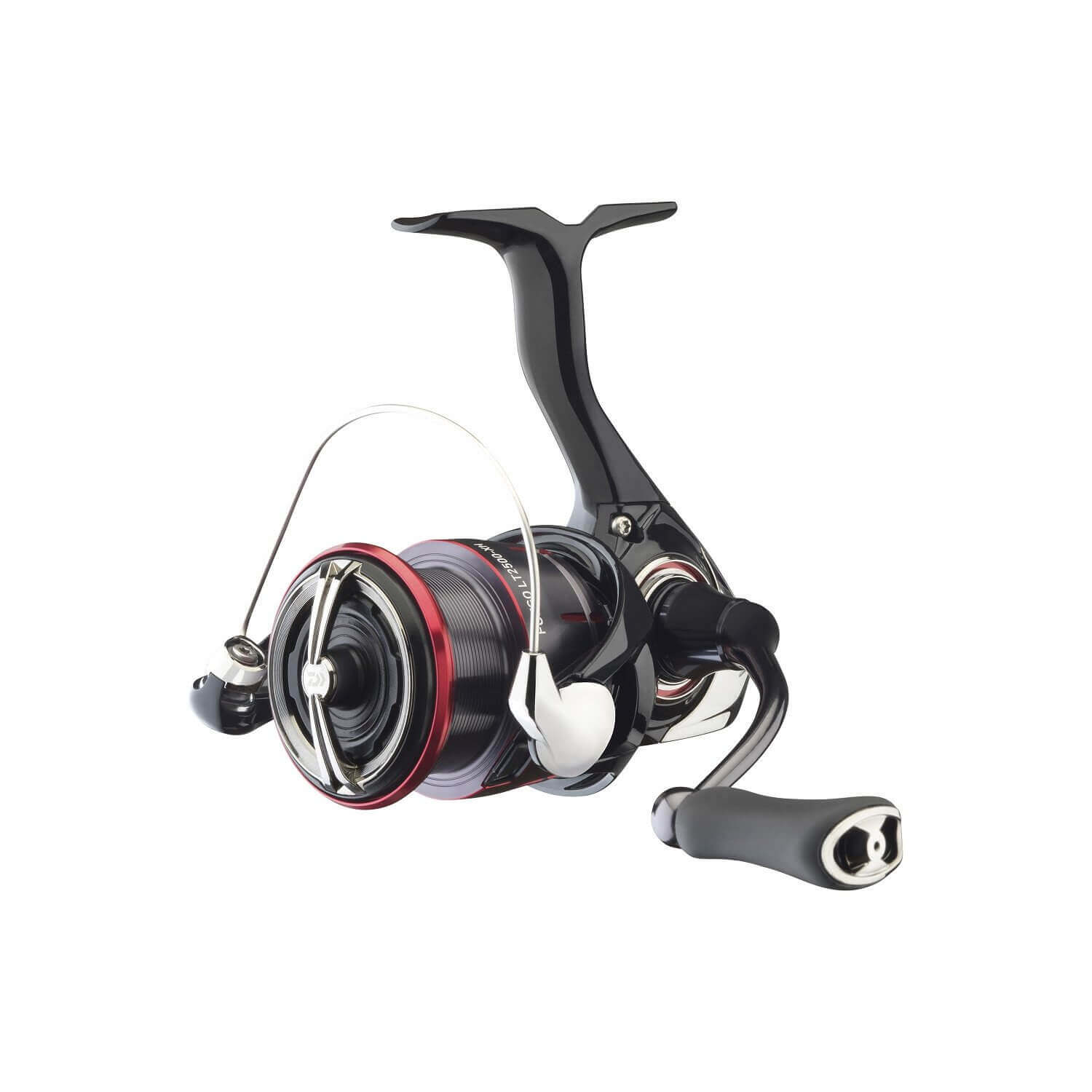 Bobina di Spinning del marchio Daiwa gamma Fuoco 23 LT 2500 CXH con design nero, grigio e rosso, speciale per la pesca alla spigola e ai predatori.