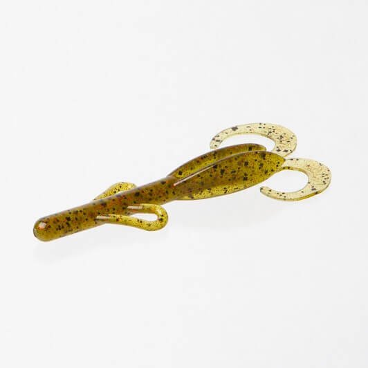 Softbait a forma di insetto corpo solido e appendici multiple da 114 millimetri del marchio Zoom modello Decespugliatore di medie dimensioni a colori verde con strisce rosse e nere. È impregnato di sale.