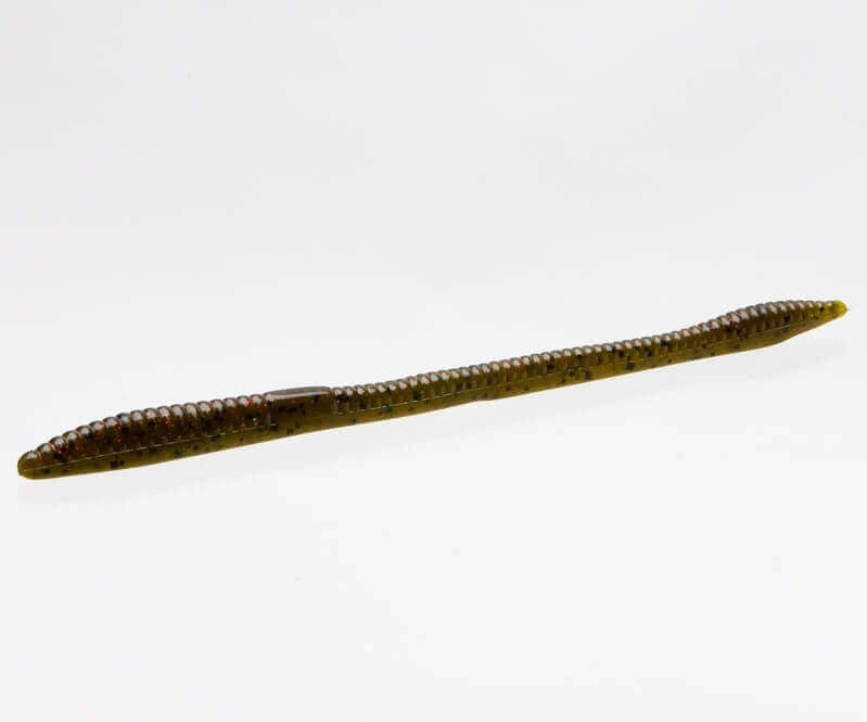 Softbait sotto forma di verme a coda dritta di 170 millimetri del marchio Zoom modello Verme truccato colore verde con macchie rosso e nero. Si tratta di un verme a segmenti standard con azione di scorrimento naturale. È impregnato di sale.