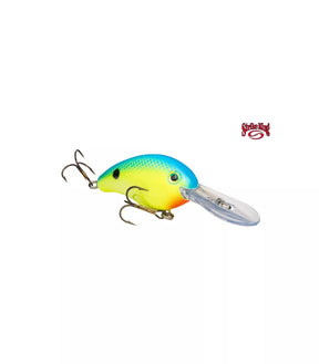 Dimensioni esca galleggiante tipo crankbait media da 110 millimetri del marchio Strike King Modello Pro Serie 4S a colori giallo, verde e blu. Questo pesce eccelle nelle acque poco profonde. La sua corazza sovradimensionata rimbalza sugli ostacoli mentre scorre negli strati intermedi dell'acqua.