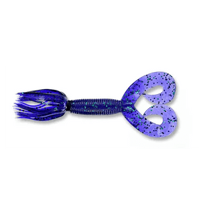 Softbait da 127 mm del marchio Yamamoto modello Double Tail Hula Grub colore viola con macchie nere e verdi, speciale per la pesca al black bass e ai predatori. Si caratterizza per il doppio movimento della coda e per le frange, ideali per essere montate in diversi modi. Grazie alla sua forma unica, questa Softbait rimane sul fondo e offre molta azione.
