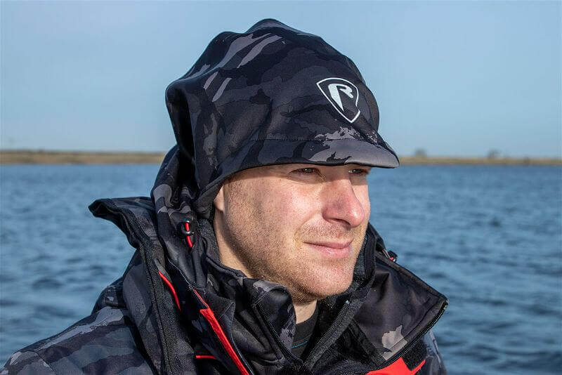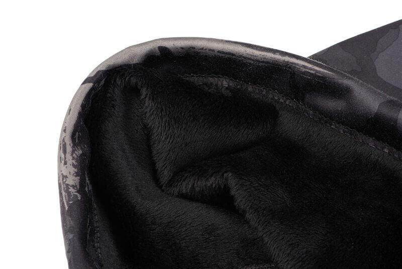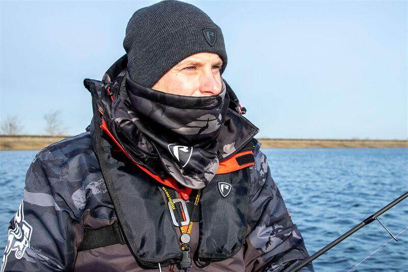 Scaldacollo termico del marchio Fox Rage con design mimetico in grigio y nero con logo biancospeciale per la pesca alla spigola e ai predatori.