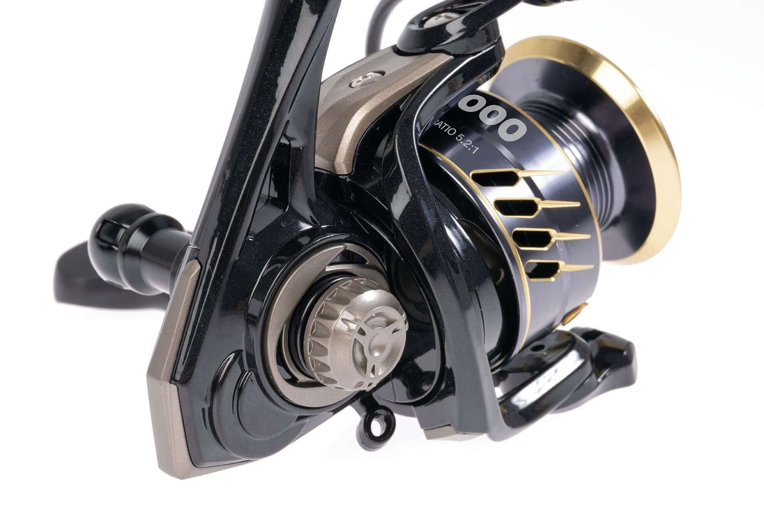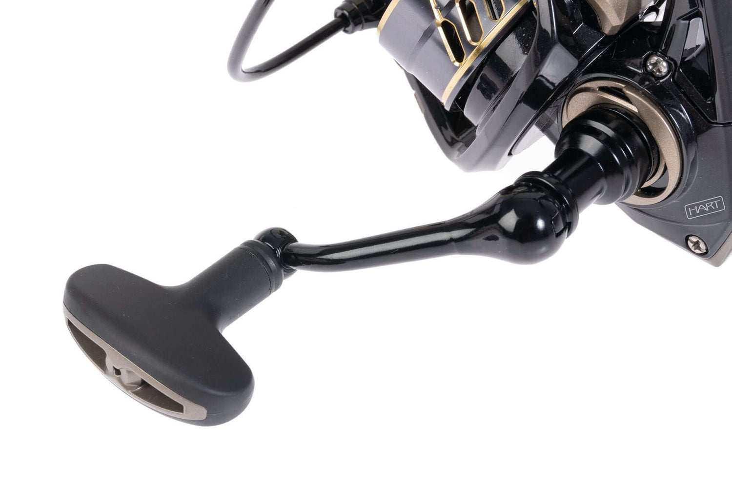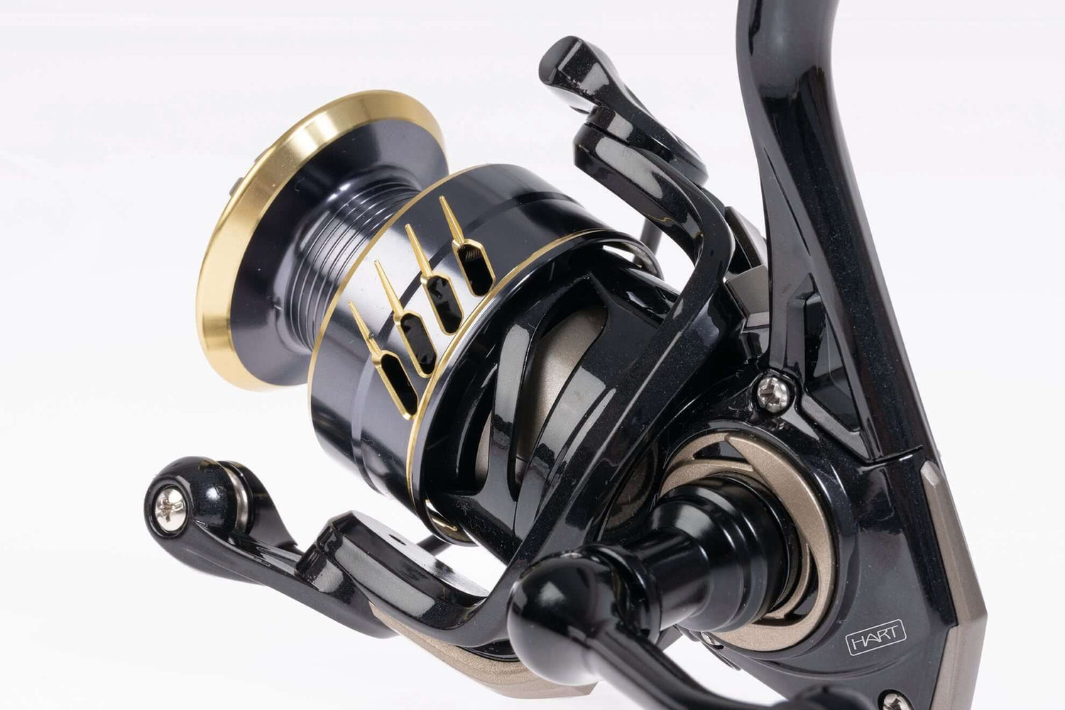 Bobina di spinning del marchio Hart modello Fiamma, a colori nero e oro, speciale per la pesca al black bass e ai predatori.