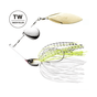 Esca artificiale Spinnerbaits del marchio Shimano modello Esca BT Swagy in colore bianco, giallo e nero, da 14 grammi peso, soprattutto per la pesca alla spigola.