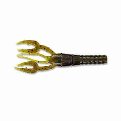 Softbait scaglia a forma di granchio di 95 millimetri del marchio Yamamoto modello Fat Baby Craw a colori verde con strisce nere, verdi e violaAppositamente progettato per la pesca alla spigola e ai predatori. Ha un corpo rotondo e artigli. È impregnato di sale.