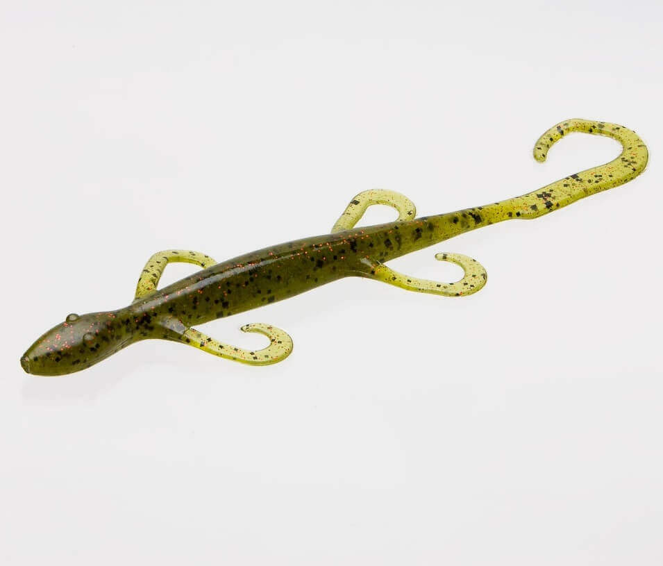 Softbait a forma di lucertola da 203 millimetri del marchio Zoom modello Magnum Lizard a colori verde con strisce rosse e nere. È una lucertola dal corpo snello, con zampe libere e coda arricciata. È impregnata di sale.
